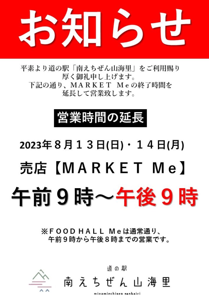 8月13日(日)と14日(月)は、営業時間を延長いたします。