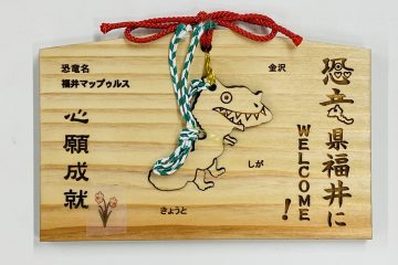 恐竜の名前は、福井マップゥルス。福井県地図をモチーフにデザインしたお守りです。